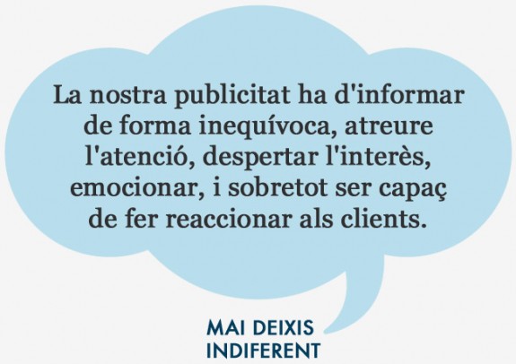 La nostra publicitat ha d’informar de forma inequívoca, atreure l’atenció, despertar l’interès, emocionar, ser capaç de fer reaccionar als clients i sobretot mai deixar indiferent.Tingues-ho present en tota la teva comunicació: