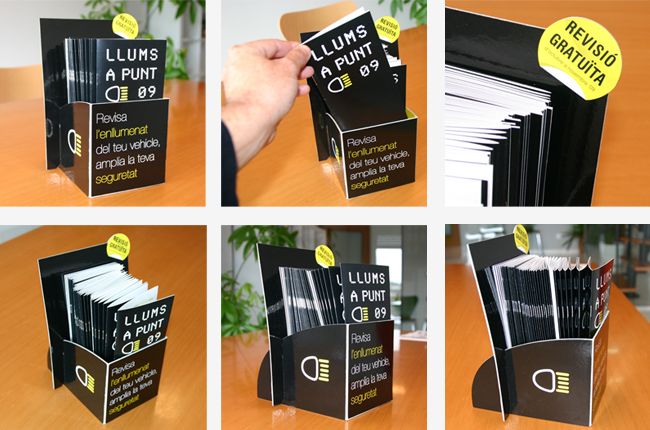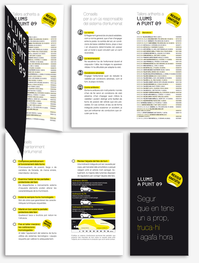 Mecánica de la campaña La campaña de publicidad se ha llevado a término con una acción one to one a todas las entradas de vehículos a talleres adheridos de Catalunya. La mecánica promocional para garantizar el éxito de la operación consiste en ofrecer gratuitamente la revisión del alumbrado del vehículo. Para la campaña de comunicación se ha creado un naiming: «luces a punto» con una imagen iconográfica asociada a la identidad de las luces, en este caso el mensaje publicitario se construye con una imagen gráfica diseñada con leds lumínicos.