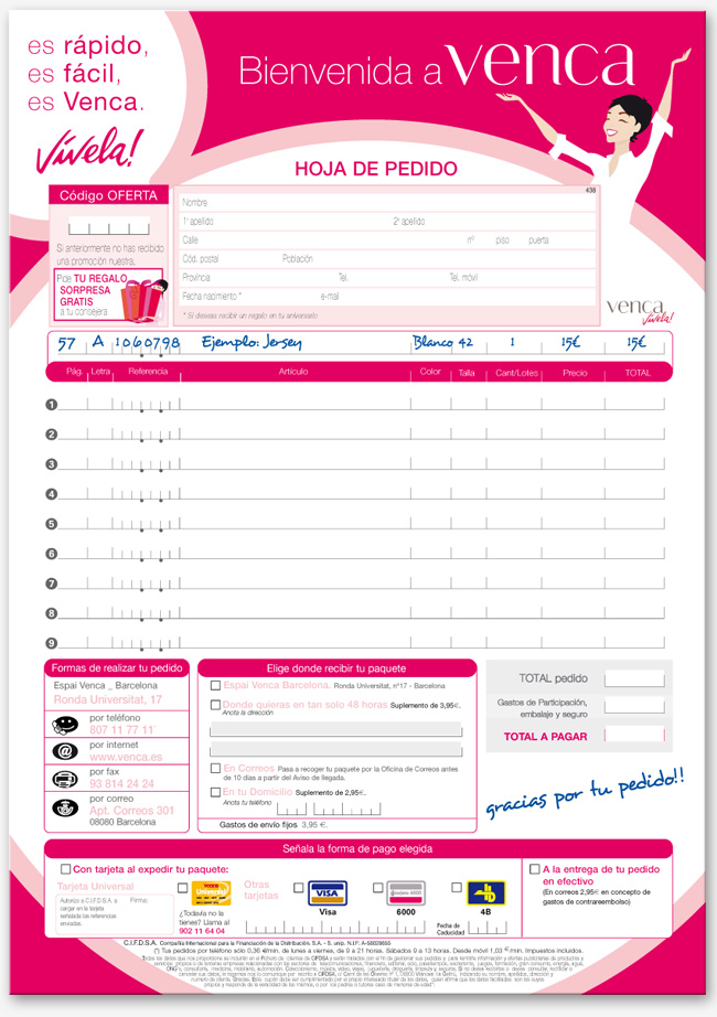 La ilustración de la «Chica Venca» fue utilizada en la comunicación de servicios y en todos los documentos relacionados con el Espacio Venca en su 1er año de lanzamiento. Como esta hoja de pedido.