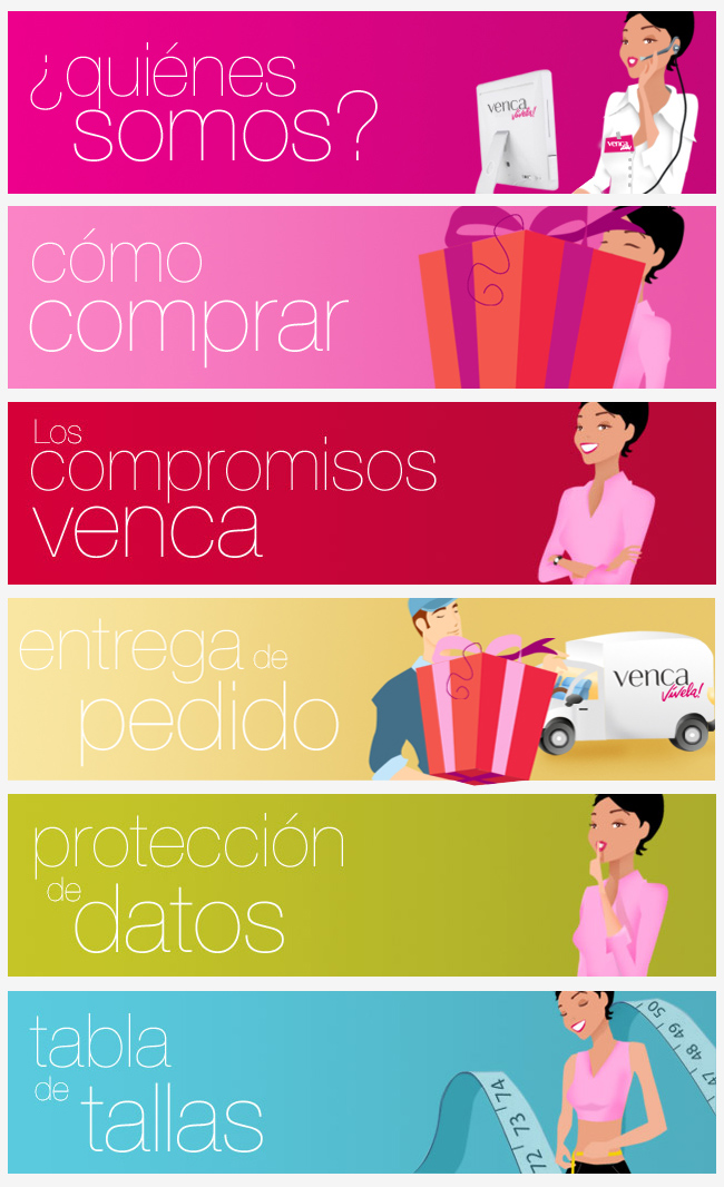 Para crear las distintos documentos para la comunicación de servicios del Espacio Venca, flyers, hojas de pedido, carteles informativos, etc… creamos la «Chica Venca», un mismo personaje, mujer, alegre, dinámica, atenta, que a modo de cara amable ilustraba cada una de las comunicaciones relacionadas con el Espacio Venca.